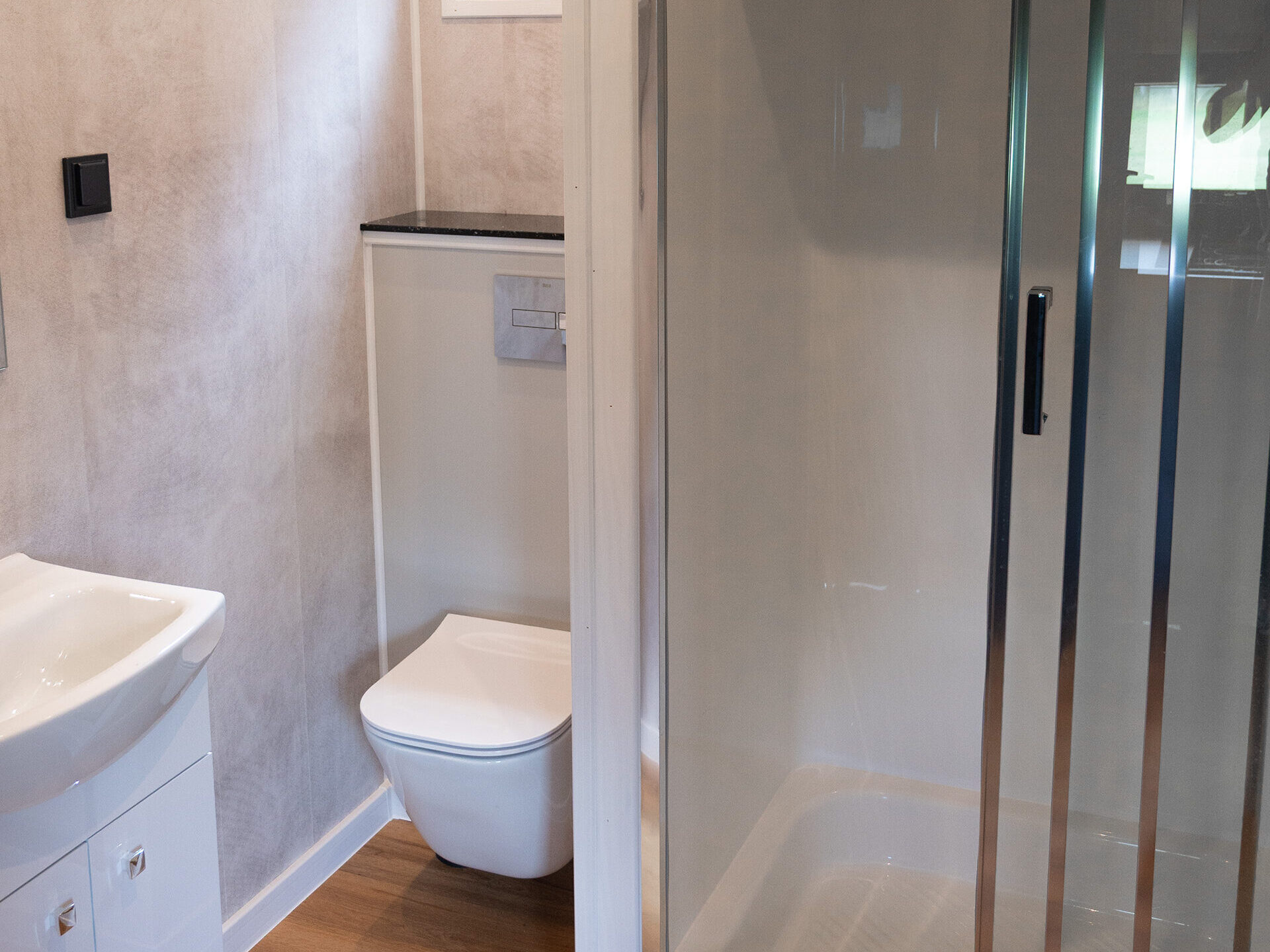 Domki komfort pomieszczą do 6 osób na 3 łóżkach piętrowych, w domku znajduje się łazienka z prysznicem.